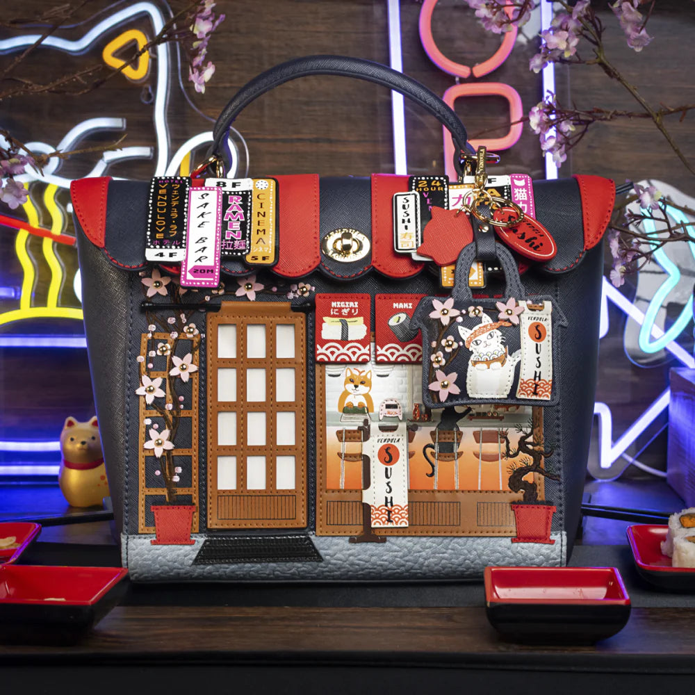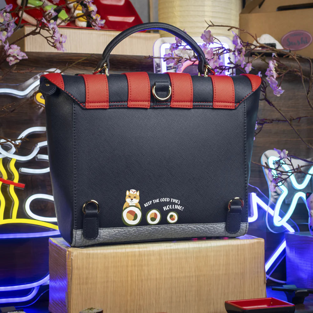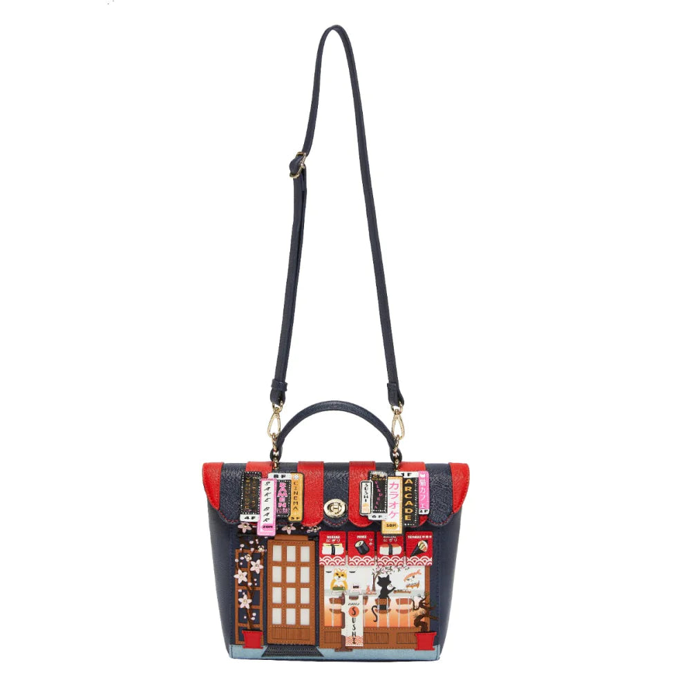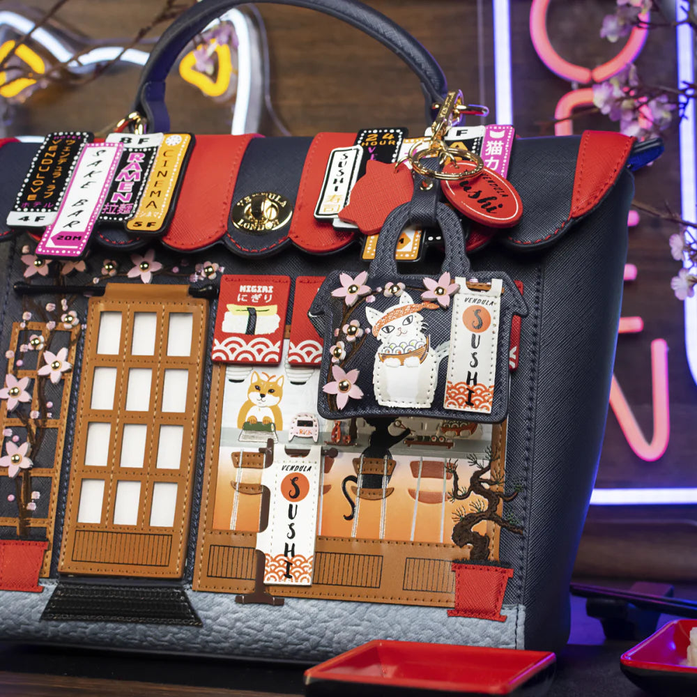 The Vendula Sushi - Blue Edition Classic Backpack is truly amazing and Ideal for everyday use or any occasion, this vegan leather bag fits all your essentials, including a matching wallet, in its roomy compartment. It features a handle and comes with two detachable straps so you can carry it as a backpack, shoulder bag, or crossbody bag. Aesthetically, it does not disappoint, boasting a soft taupe and red palette with a Japanese restaurant-themed artwork that will make you wish you could sit down for lunch or dinner there. Versatile, practical, and elegant—this new Vendula bag truly has it all!