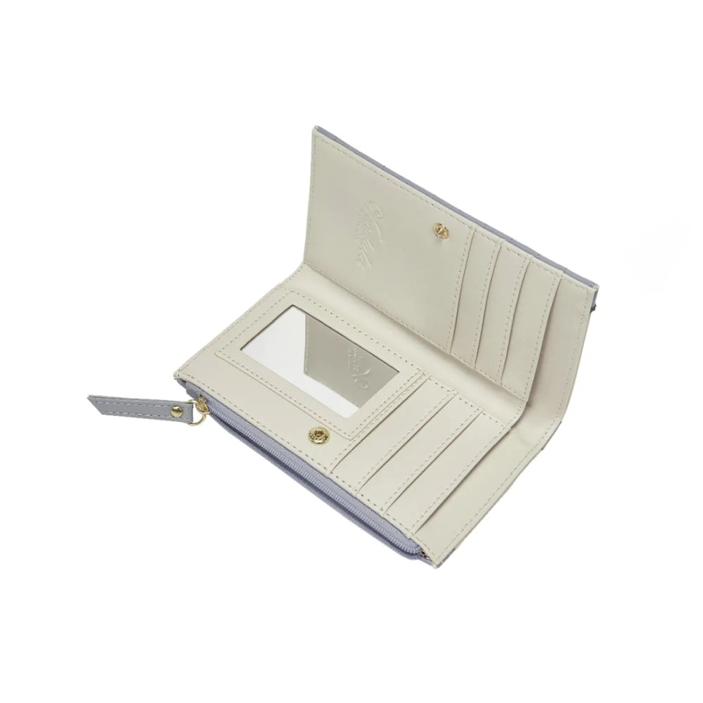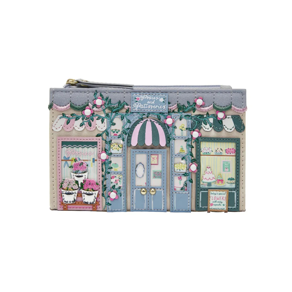 Cute florals meet playful sweetness in the Posies and Patisseries Compact Folding Wallet, a small companion with double the charm. This vegan leather wallet fits most Vendula Vintage Rose bags and holds six cards, coins, notes, and receipts, all secured with a flap and zip closure.