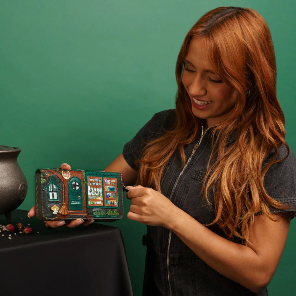 Forget black magic—you’ll fall for the Witches Pantry Large Ziparound Wallet instantly. Designed to fit in your handbag or backpack, it features several card slots, a zippered coin section, and slip pockets for receipts and notes. Its secure ziparound closure keeps everything safe from goblins (or nosy familiars). Made from vegan leather, it’s decorated with a wooden witch house, potions, and our mischievous witch cat and spider. Trick or treat? We say treat!